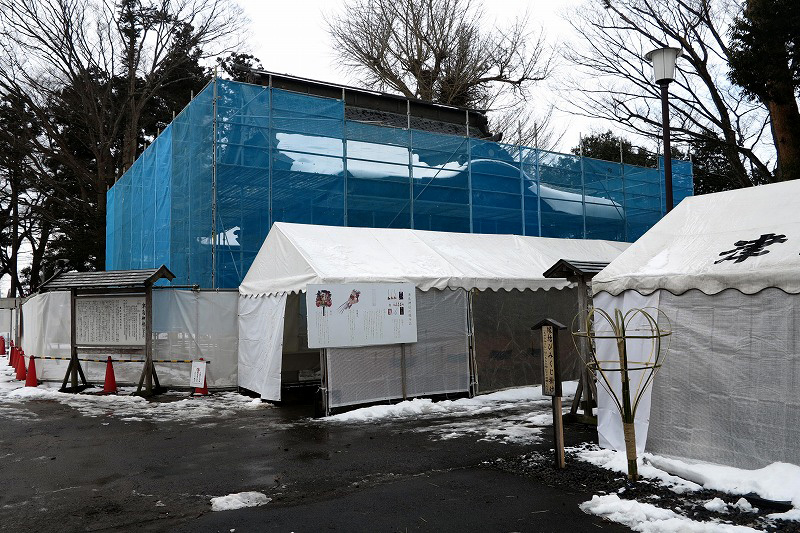 で、残念ながら拝殿・本殿は改修工事中でした。拝殿場所も仮で用意されてました。 ここの祭神はそうそうたるメンバーが祭られてるのでしっかりご挨拶しておきましょう。