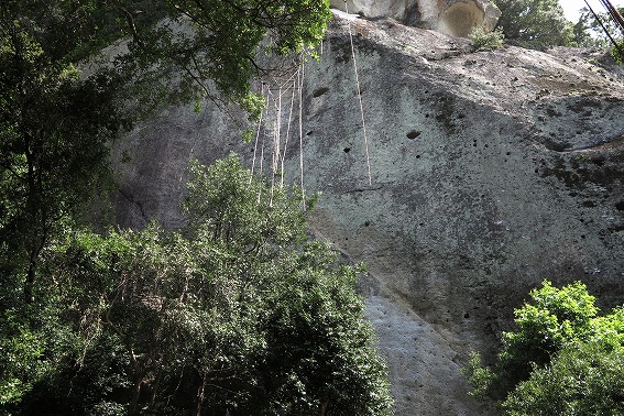 約10メートルの三旒の幡形、下部に種々の季節の花々や扇子等を結びつけ、 日本一長いともいわれる約170メートルの大綱に吊し、大綱の一端を岩窟上45メートル程の高さの御神体に、 もう一端を境内南隅の松の御神木に固定する神事だそうで村人等で行うみたいですね。