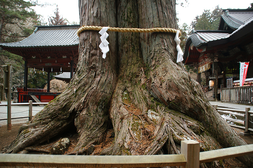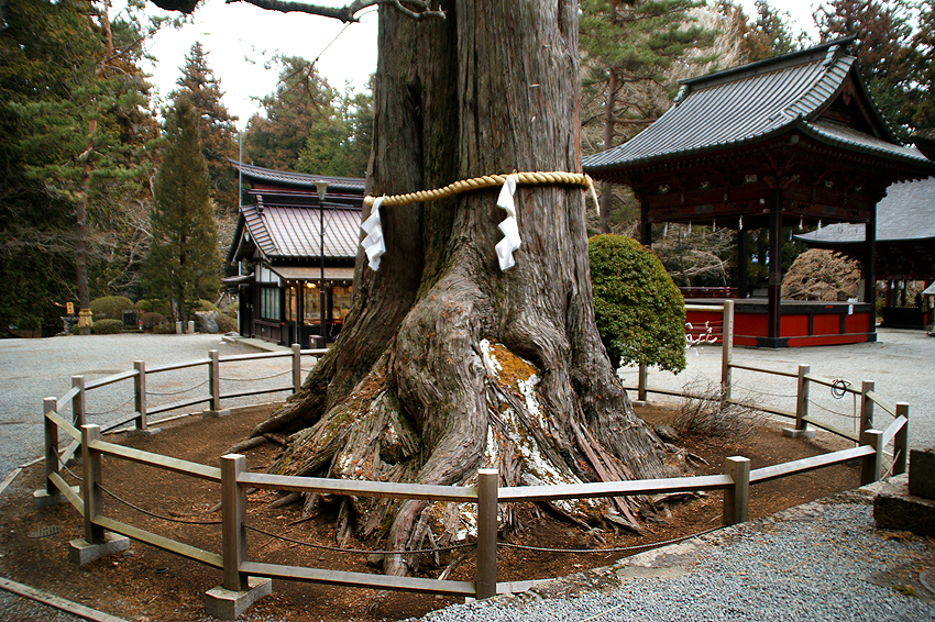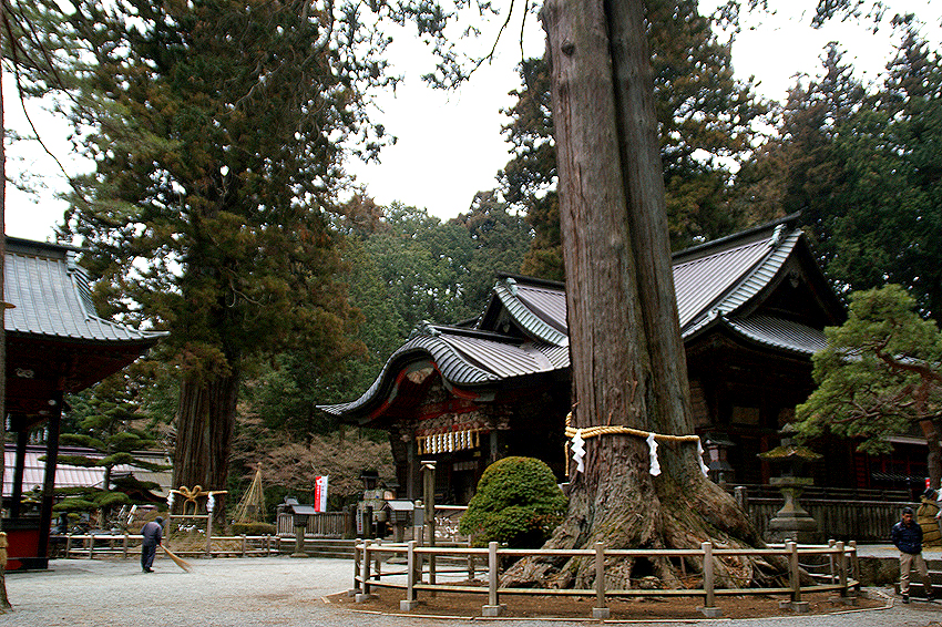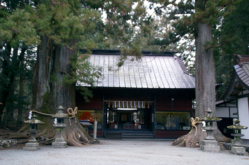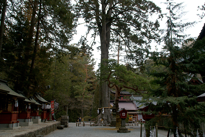 左側にも大きな社があります。行ってみましょう。ここにも大きな桧が両サイドに。