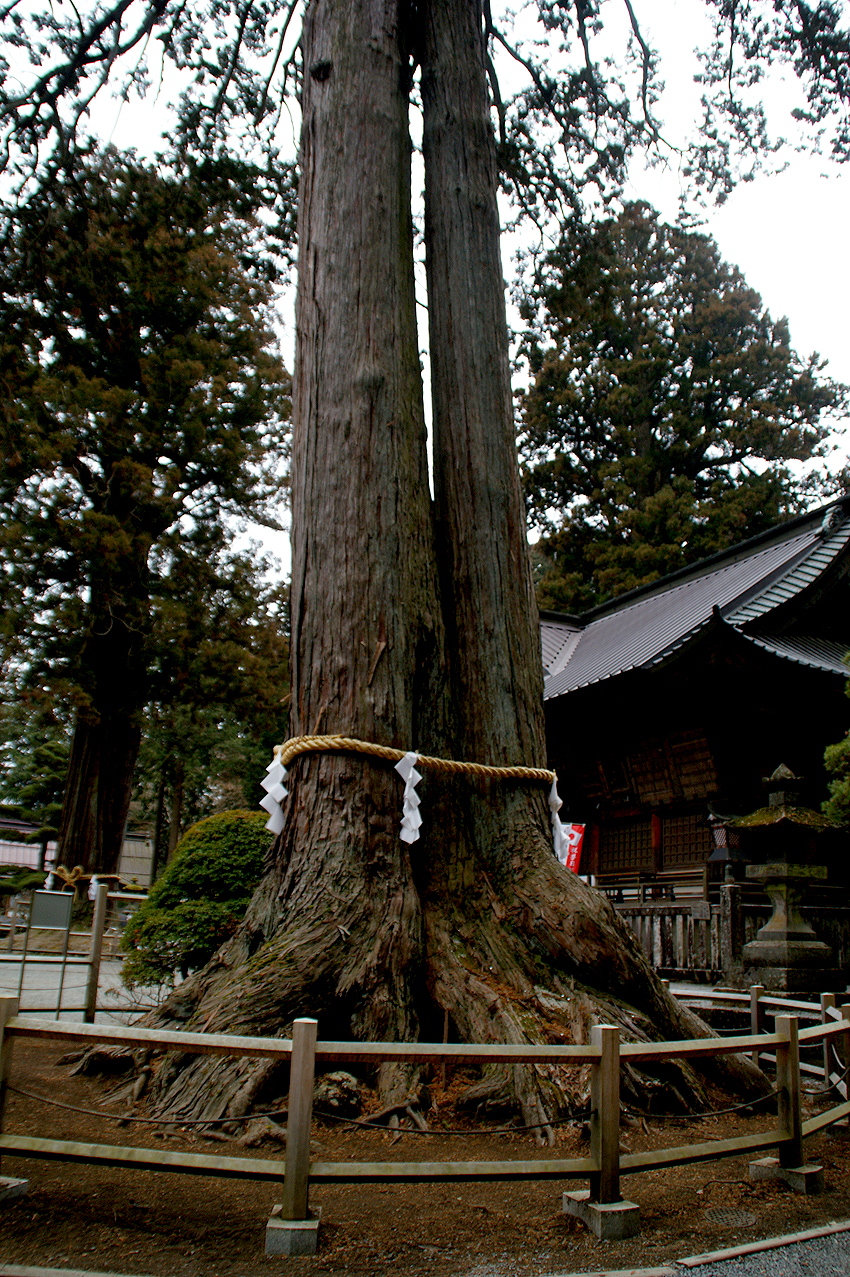 真ん中に聳え立ち桧ですが、2本の夫婦なんですよ。