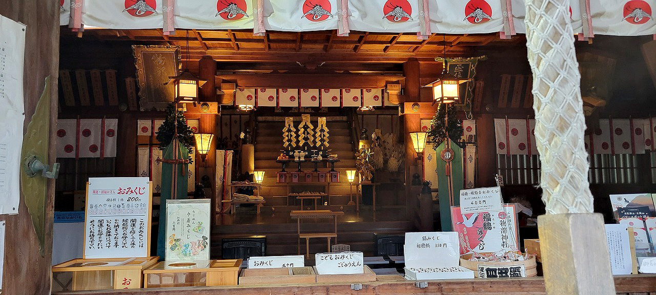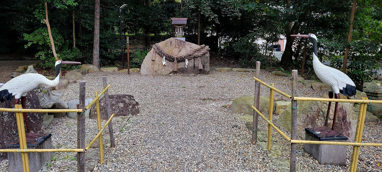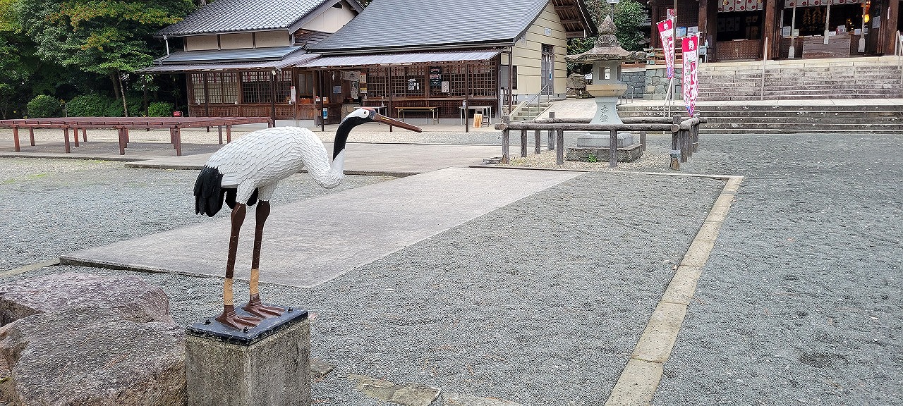 宇摩志麻遅命は神武天皇の時代に各地の凶悪な賊を成敗し世の中を穏やかに治め、最後に神社近くの 鶴符山に鶴に乗って降臨し、国見し神社の裏山「八百山」が天香具山(あまのかぐやま)に似ていることから 宮を築き鎮座されたとの事で、この神社にはあちこちに鶴の模型があります。