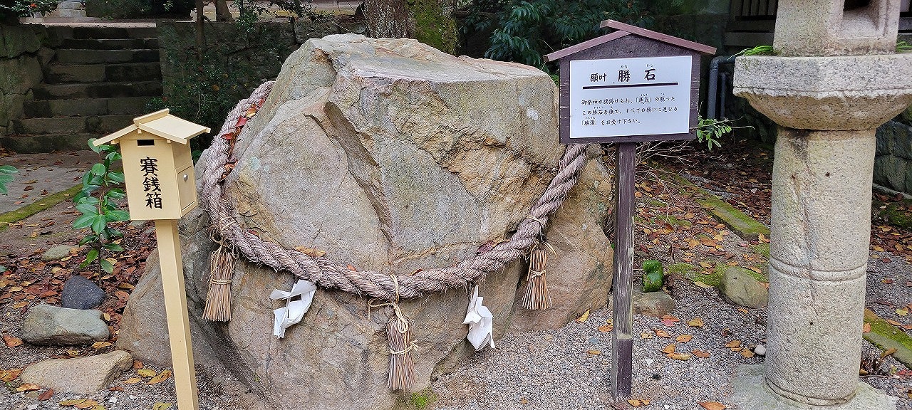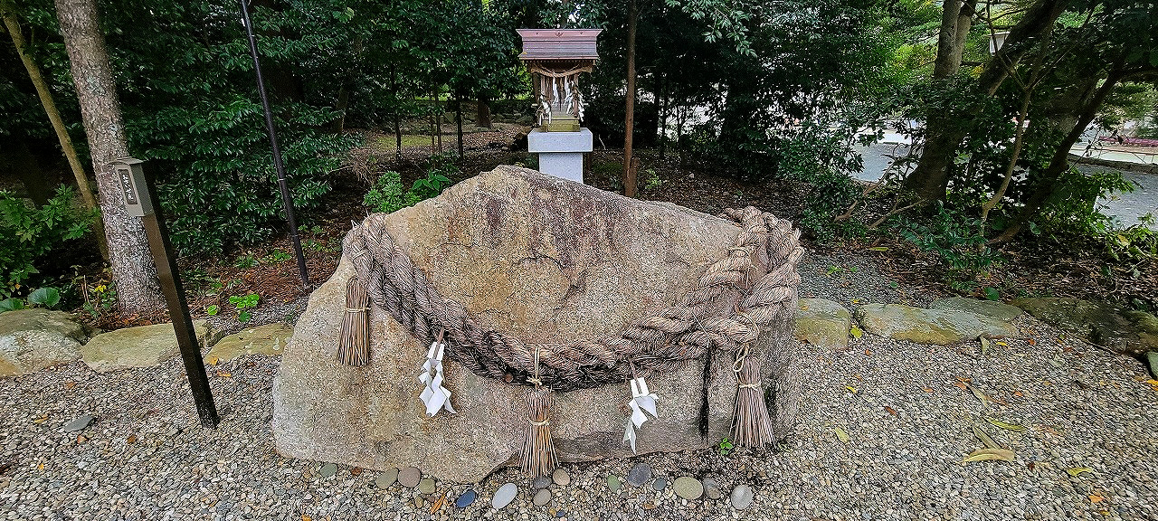 宇摩志麻遅命が石見の地に降臨された際にお腰を掛けられたと言われる岩だそうです。 触ると勝運の御神徳が得られるとか。